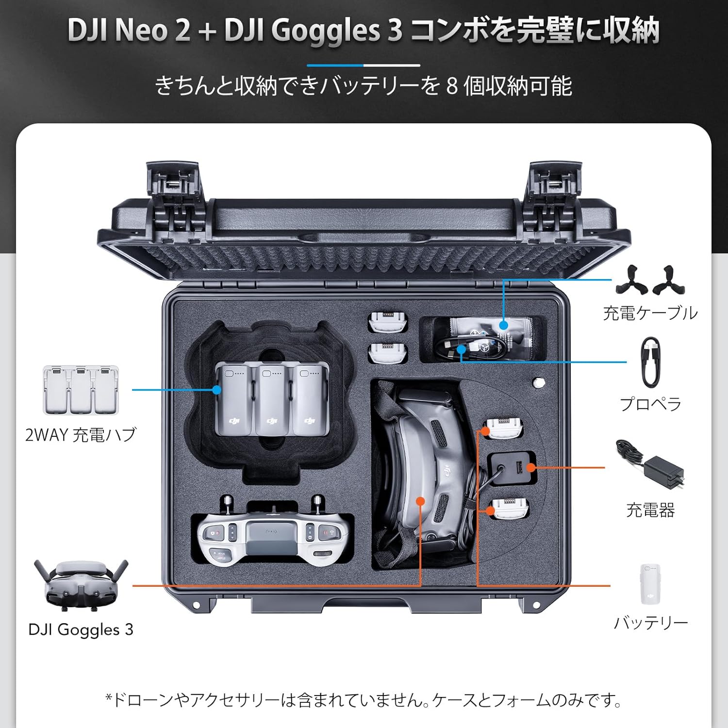 ◎【対応機種】DJI Neo 2 本体、ゴーグルN3/3、RCモーション3、FPV送信機3、最大でバッテリー8個、充電器、充電ハブ、プロペラと他のComboのものを収納可能。