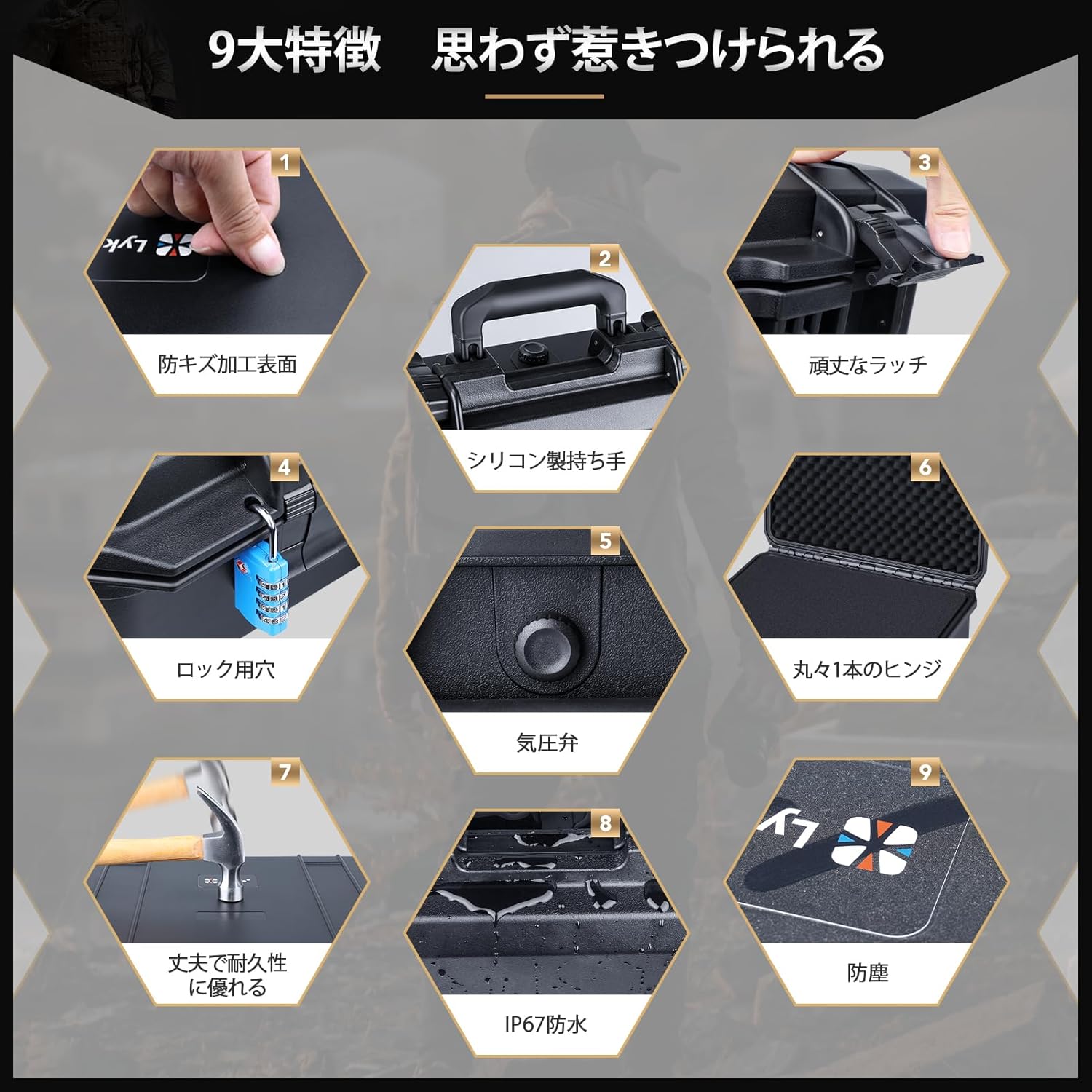 Lykus製品は、世界30か国以上で愛用されており、その信頼性と機能性が高く評価されています。特に欧米市場での人気が高く、プロのオペレーターからも選ばれることが多いです。YouTubeやSNSでの露出も多く、その実用性とスタイリッシュなデザインが多くのファンに支持されています。このケースは、SGS認証を受けたIP67級の防水・防塵仕様で、あらゆる環境下での使用に適しています。耐衝撃性と密閉性を兼ね備え、あらゆる機材とそのアクセサリーを安全に保護します。機材を守りながらもスタイルを損なわない理想的な選択肢と言えるでしょう。