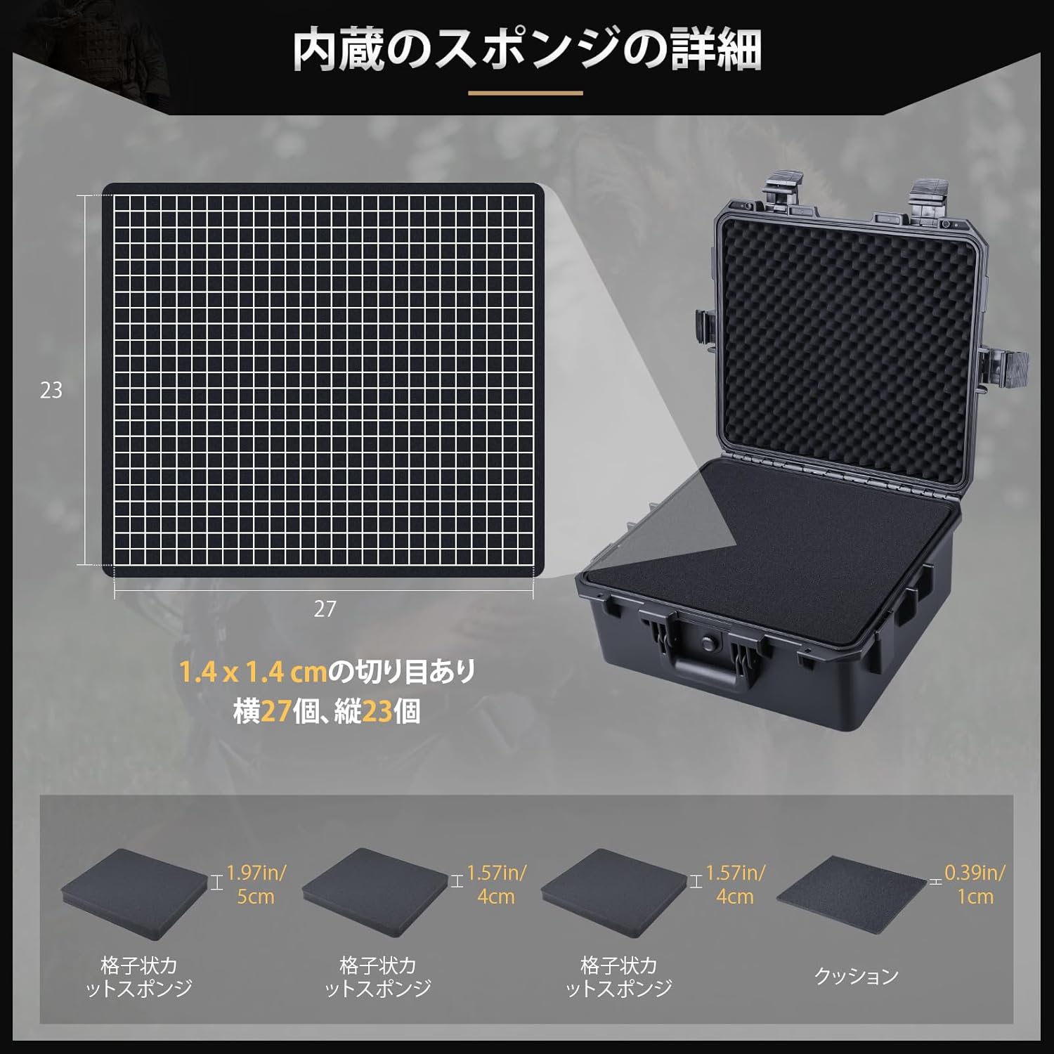◎外部寸法: 47x42x20.5 cm | 内部寸法(空箱、スポンジ無): 41x36x19 cm | 利用可能寸法(スポンジ付): 38×32.5×18.6 cm